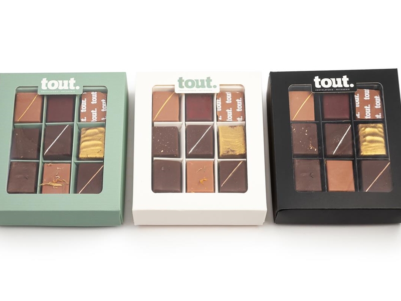 Een doosje met een collectie van 9 verschillende bonbons.