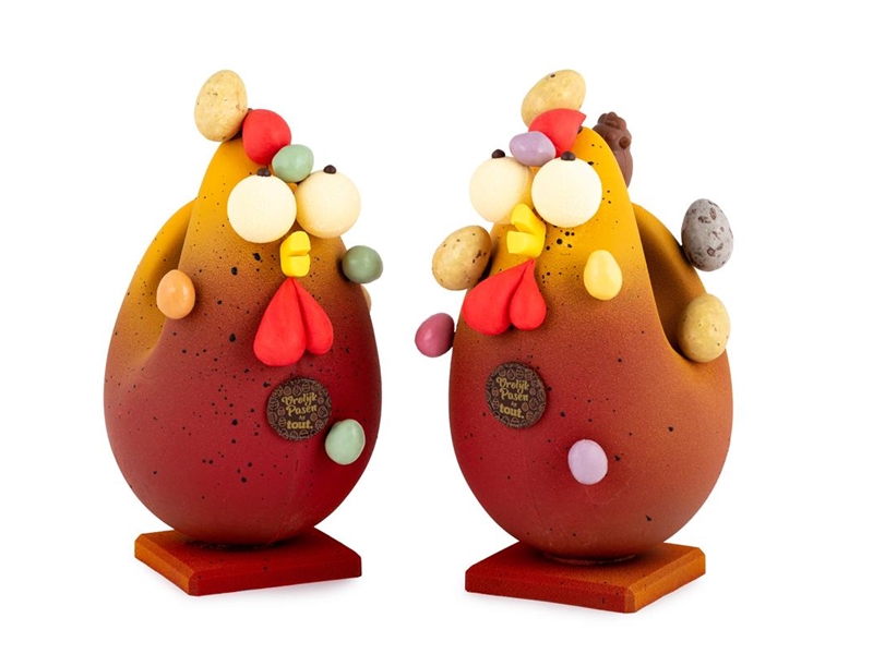 Een hele gezellige Kip voor op de Paas tafel! Gemaakt van heerlijke Varlhona melk chocolade en gedecoreerd met een assortiment van paas eitjes.
